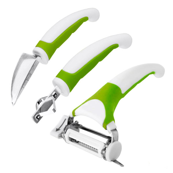 - Универсальный нож с тремя лезвиями - с его помощью вы сможете быстро чистить, резать и украшать ваши фрукты и овощи!