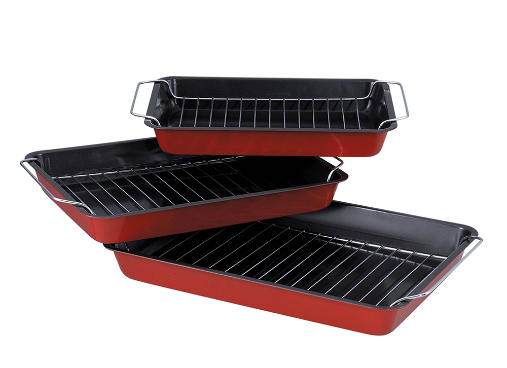 - Три противня из углеродистой стали с противопригарным покрытием внутри и жаростойкой краской снаружи.